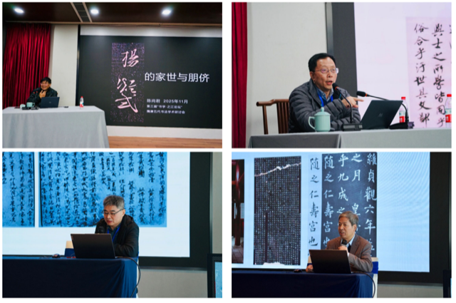 本届论坛共举办4场专家主旨演讲,围绕隋唐五代时期著名书家的生平事迹、交游考述以及书法风格形成的社会文化背景展开。复旦大学中国语言文学系教授、中国唐代文学学会名誉会长陈尚君作题为《杨凝式的家世与朋侪》的演讲,深入剖析杨凝式家世与友朋关系,揭示其书法风格转变的内在逻辑与外在影响;清华大学人文学院院长、教授,全国古籍整理出版规划领导小组成员刘石作题为《谈谈启功先生佚稿〈智永和虞世南的关系〉》的演讲,探讨了智永与虞世南之间的书法传承关系;华东师范大学美术学院副院长、教授,上海市书协理事兼教育与交流委员会秘书长崔树强作题为《从新出资料论唐代楷书的书写性》的演讲,基于新出土资料重新审视唐代楷书的书写性特征,展现了书法研究的动态发展;陕西师范大学历史文化学院教授、中国唐史学会秘书长介永强作题为《欧阳询〈九成宫醴泉铭〉书法的经典化历程》的演讲,分析了欧阳询书法在艺术历史长河中逐渐确立不可动摇地位的历程。