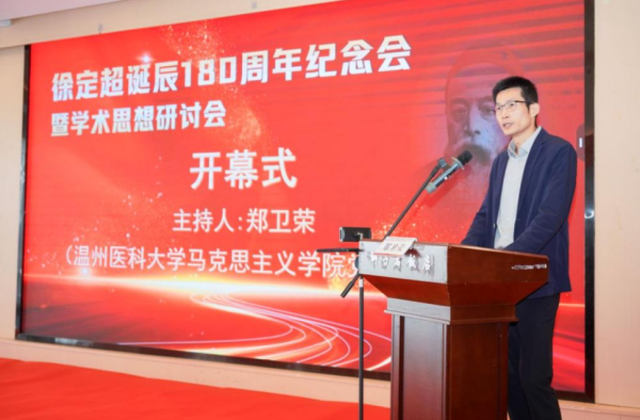 “家住枫林罕见枫,晚秋闲步夕阳中。此间好景无人识,乌桕经霜满树红”。在徐定超先生咏叹故乡秋色的名句烘托下,葛益平、金焕民、钟方成分别发表致辞,大会启幕。开幕式由温州医科大学马克思主义学院党委书记郑卫荣主持。