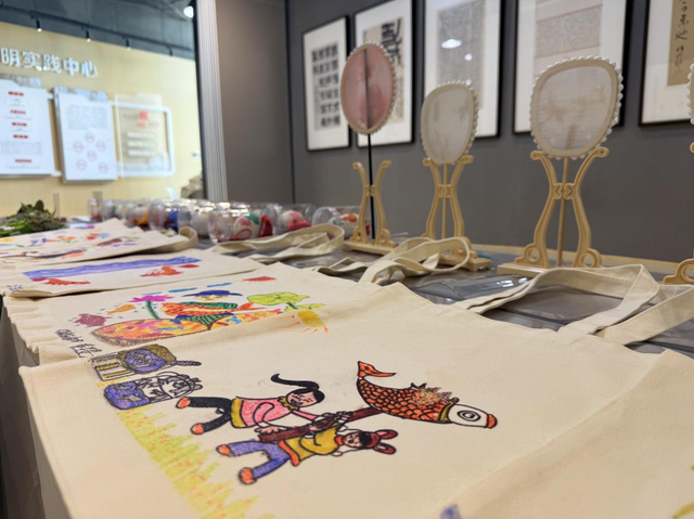 展台上,一件件充满童趣与传统韵味的秀洲非遗手工作品井然陈列,格外引人注目。憨态可掬的彩蛋画上笔触奔放、想象飞扬;薄如蝉翼的蚕丝团扇洁白精美,加上精巧装饰,更显小巧雅致;棕叶编织的玫瑰花束仿佛仍带着自然清香,令人忍不住凑近细嗅;色彩明快、图案质朴的帆布袋则引得孩子们纷纷背起展示,趣味横生。