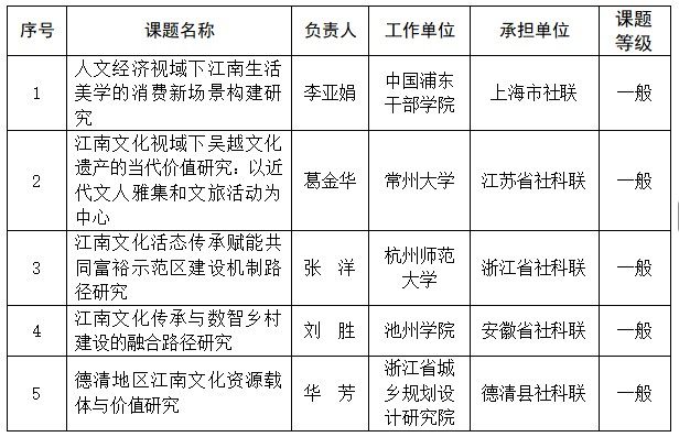 为深化长三角江南文化研究学术共同体建设,提升江南文化影响力,根据《关于召开第七届“长三角江南文化论坛”的通知》,经省社科联党组研究同意,以下课题拟立项为省社科规划一般课题,现将名单公示如下: